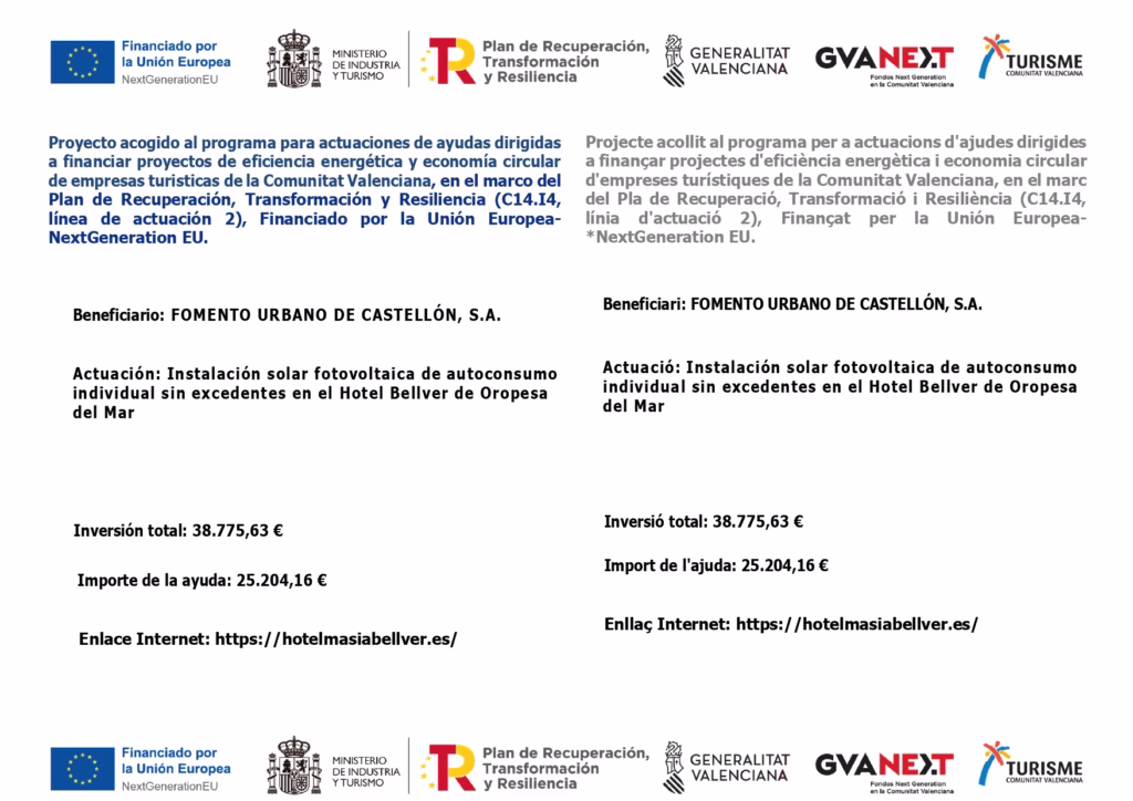 El Hotel Bellver ha instalado una planta solar fotovoltaica de autoconsumo para reducir su consumo energético, mejorar la eficiencia y disminuir las emisiones de CO₂. Esta actuación contribuye a un modelo de turismo más sostenible y ha contado con el apoyo financiero de la Unión Europea – NextGenerationEU, en el marco del Plan de Recuperación, Transformación y Resiliencia.